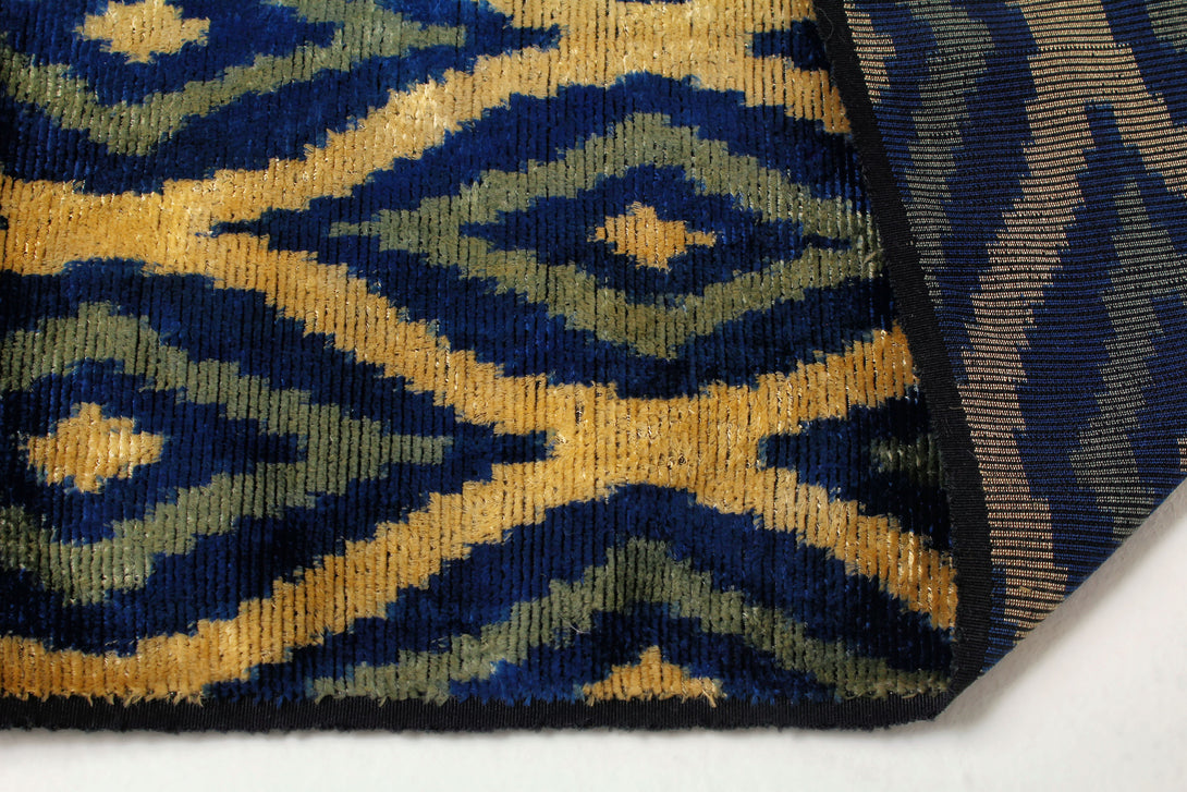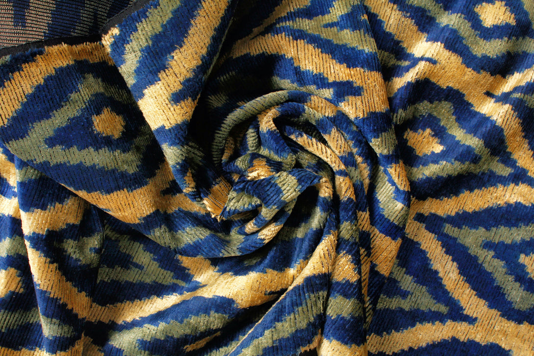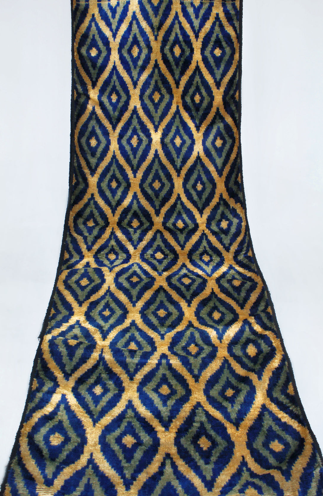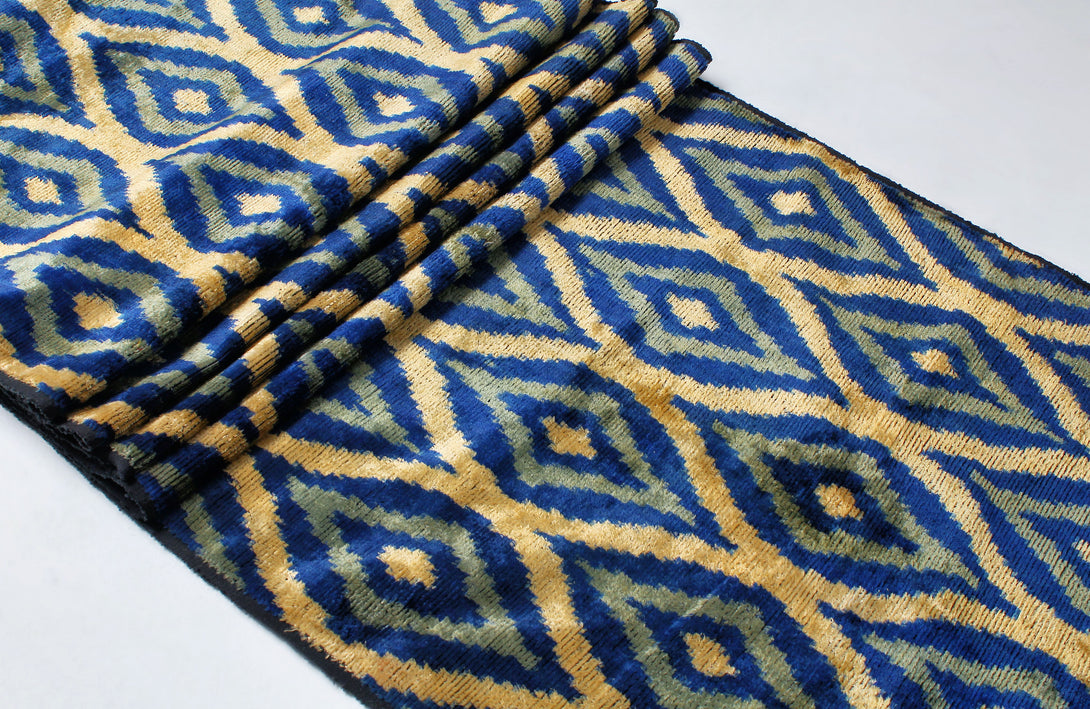 Discover the unmatched elegance of our handwoven Silk Velvet Ikat Fabric, expertly crafted by skilled artisans. This luxurious velvet fabric showcases a timeless Ikat pattern, characterized by its vibrant blue and gold color scheme. The intricate diamond design adds a touch of sophistication, making this fabric perfect for a wide range of applications.