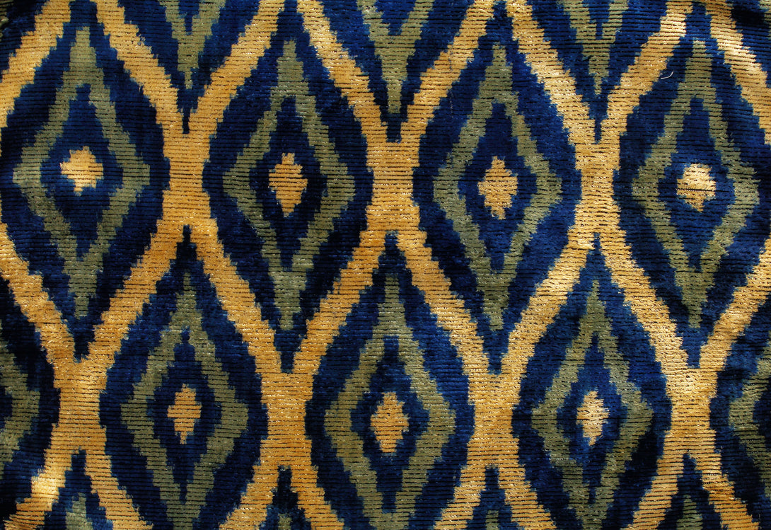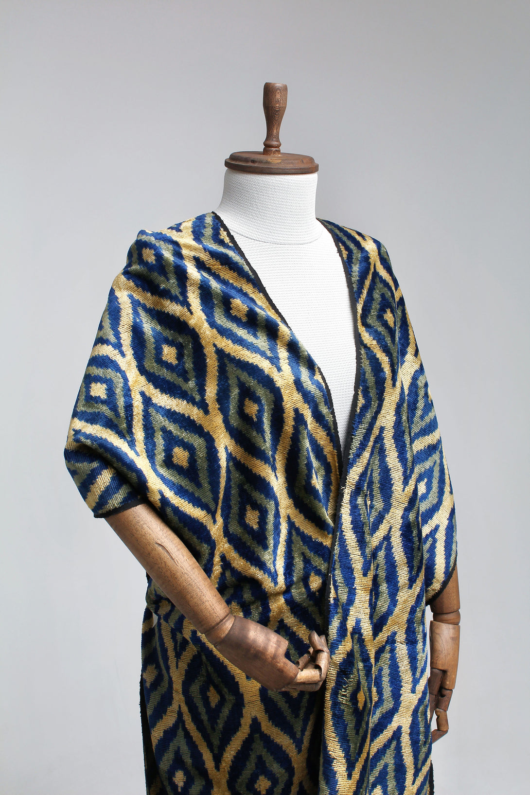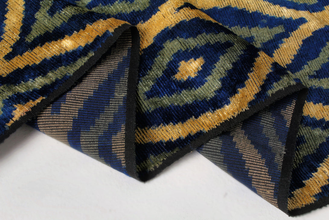 Discover the unmatched elegance of our handwoven Silk Velvet Ikat Fabric, expertly crafted by skilled artisans. This luxurious velvet fabric showcases a timeless Ikat pattern, characterized by its vibrant blue and gold color scheme. The intricate diamond design adds a touch of sophistication, making this fabric perfect for a wide range of applications.