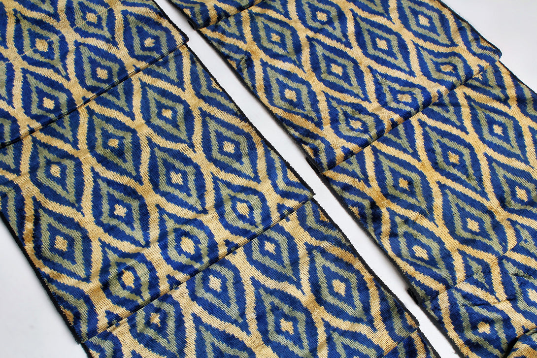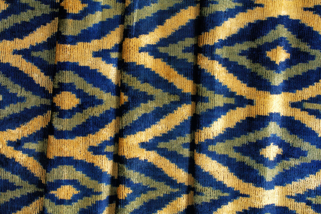 The stunning Bakhmal Uzbek Ikat fabrics are Velvet Ikats hand-made from 100% pure silk. These rare fabrics combine exceptional beauty with ultimate comfort. The soft, smooth fabric boasts elegance and a high-end feel. It is velvety smooth to the touch, and is splendid in its refined and graceful appearance. In a way, it is the very epitome of luxury and style all-around in its design, presentation and material.