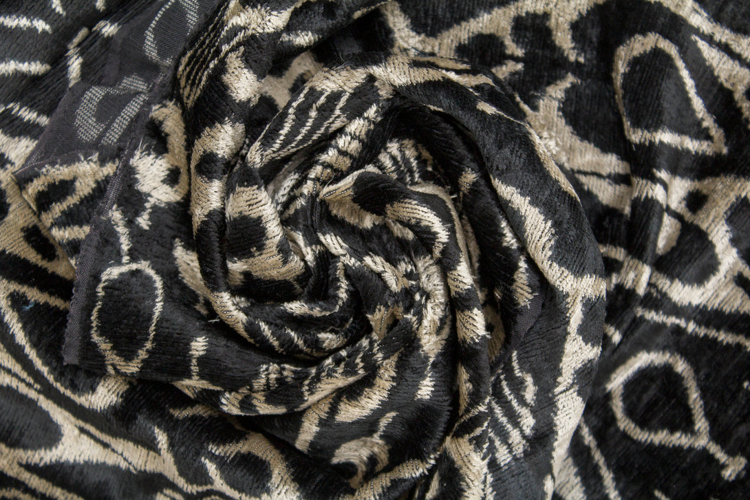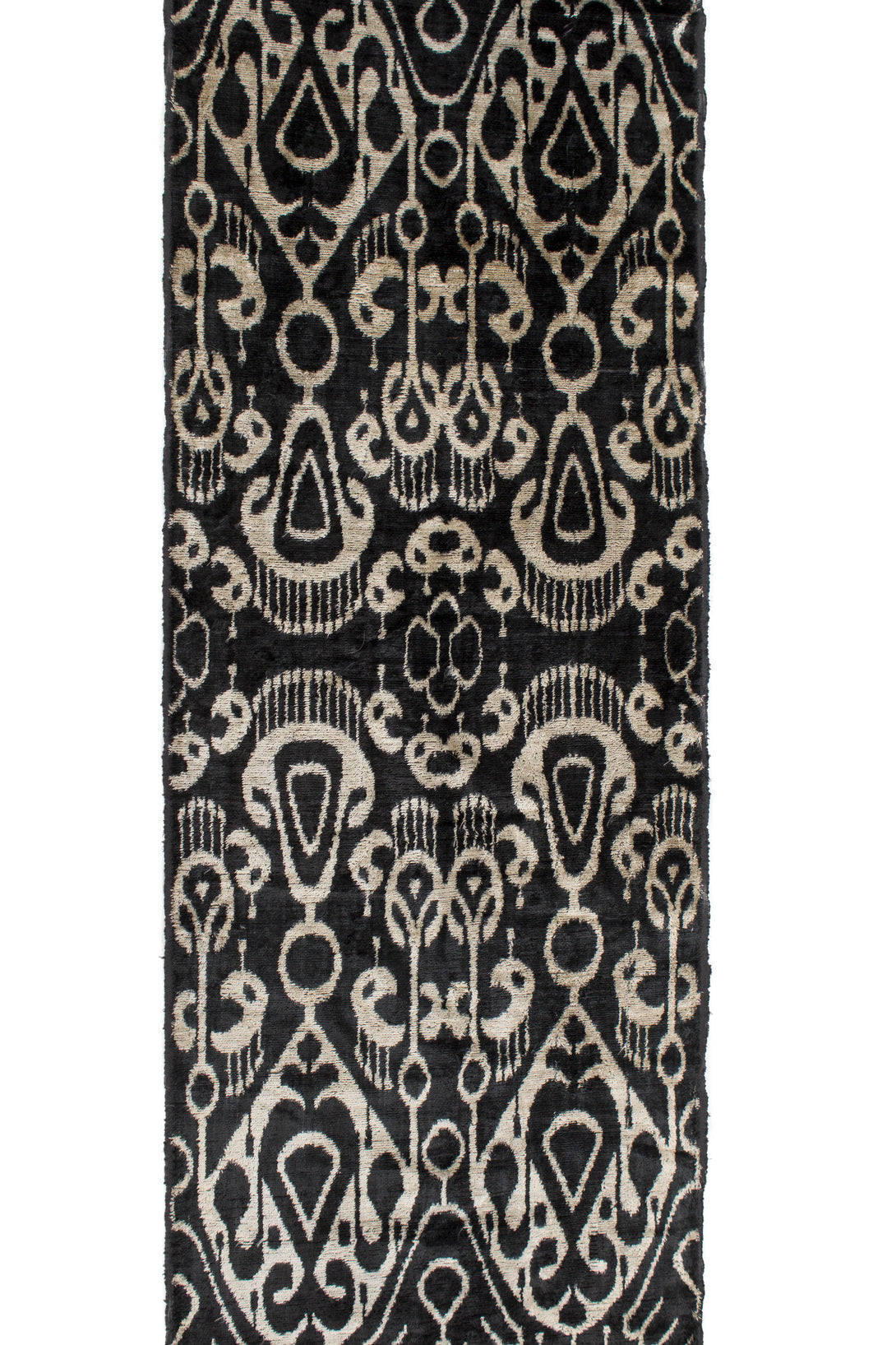 Os deslumbrantes tecidos Ikat Bakhmal Uzbeques são Ikats de veludo feitos à mão a partir de seda pura tecida na camada de base de seda/algodão. Esses tecidos raros combinam uma beleza excecional com enorme conforto. O tecido suave e liso ostenta uma elegância e uma sensação de alta qualidade. É aveludado ao toque, e esplêndido em sua aparência refinada e graciosa. De certa forma, é a verdadeira personificação do luxo e estilo no seu design, na apresentação e no material.